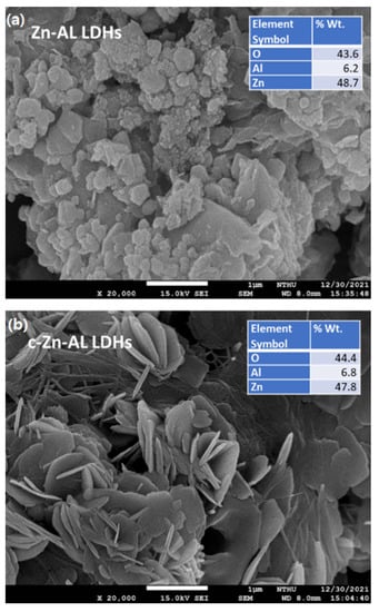 SEM-EDS of Zn-Al LDHs (a) and c-Zn-Al LDHs (b).