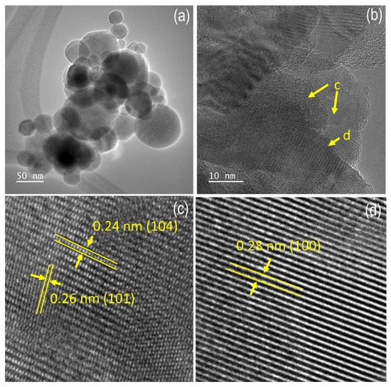 The enhancements in surface parameters consisting of the BET specific surface area, the pore volume, and the pore radius were, however, not reflected significantly by the SEM-EDS measurements presented in Figure 4. The SEM images suggest that there was a significant influence of the calcination and pore opening to the physical morphology of the LDHs. The EDS analysis results also imply that the calcination did not chemically affect the composition, which conclusively stated that the calcination gave the physical influence especially for the structure of the layers but not affecting the chemical composition. Furthermore, the layer structures were confirmed by the TEM analysis presented in Figure 5b. The identified lattice fringes from Figure 5c,d appeared with the interplanar distances of 0.24 and 0.26 nm, which are ascribed to the (104) and (101) plane of the hexagonal Zn-Al LDHs phases. In addition, some spots show the lattice fringes of 0.28 nm, which is associated with the (100) reflection of ZnO [16,18,19,20].