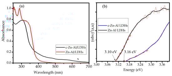 The light absorption characteristics of the Zn-Al LDHs was studied using UV-DRS analysis with the Tauc plots presented in Figure 6. As shown in Figure 6, the shift in the absorption spectrum into the lower wavelength is shown by c-Zn-Al-LDHs along with the reduced absorbance. The shift is related with the smaller crystallite size of the material and consisted with the calculated band gap energy of 3.10 and 3.16 eV (as shown by intersection lines in red) for Zn-Al LDHs and c-Zn-Al LDHs, respectively [21]. The values were less than the band gap energy of the bulk and nano ZnO, which were around 3.2 eV [22,23]. The lower band gap energy was associated with the Zn oxidation states and the chemical environment in the LDH structure that was obviously affecting the valence band of the Zn.