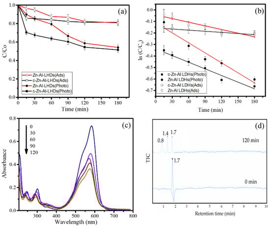 To investigate the photocatalytic activity of Zn-Al LDHs and the effect of calcination, the MV photocatalytic oxidation was performed. In particular, the studies were conducted with a 20 ppm MV concentration and a catalyst dose of 1 g/L under a 296 nm UV-light and an additional H2O2 (1%). In order to evaluate the difference between the photocatalytic mechanism and the adsorption mechanism for decreasing MV concentrations, adsorption experiments were also conducted. The kinetics plot in Figure 7 exhibits that there was photocatalytic performance of both calcined and uncalcined Zn-Al LDHs compared to the adsorption kinetics, which were due to the faster degradation of MV. As c- Zn-Al LDHs adsorption gave a faster reduction in MV concentration compared to Zn-Al LDHs, the kinetics from photocatalytic oxidation were also similar. This conclusively obtained that the specific surface area plays an important role for enhancing the oxidation mechanism, and it appropriately meets with either the theoretical aspect or similar works that stated that surface interaction is significantly included in the degradation mechanism [24]. Moreover, as proof of the degradation of MV structure, the wavelength with optimum absorbance in the UV–visible spectra of MV shows the shift over the time of treatment (Figure 7b). Referring to previous studies on methyl-containing dyes degradation, this phenomenon is associated with de-methylation as the initial step for further degraded molecules [25,26]. The HPLC analysis result presented in Figure 7d confirmed this assumption. It can be seen that the treated solution for 120 min shows not only the peak corresponding to MV but also two other peaks as the results of the degradation products.