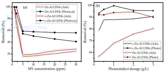 In order to ensure the significant role of photooxidation besides the adsorption mechanism, the evaluation on the effect of the MV initial concentration and the photocatalyst dosage on the removal efficiency were conducted, and the data are presented in Figure 8.