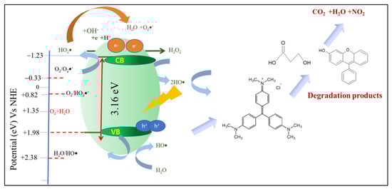 Based on the valence band diagram of some LDHs and the calculated band gap energy of 3.16 eV in Zn-AL LDHs, the possible photocatalytic mechanism is presented by the scheme in Figure 9. As the photon with energy associated with the same energy or larger than 3.16 eV or the light wavelength the same or smaller than 400 nm, there will be an electron excitation from the valence band into the conductance band that leads to the producing of radicals. The band gap energy of the photocatalyst was positioned at 3.16 eV, which is higher than that of water oxidation [E0 (H2O/·OH) = 2.38 V], and leads to the production of reactive hydroxyl radicals (·OH) to further oxidize MV via intermediates and completely form CO2 and H2O [42]. The redox potential of the CB of Zn-Al LDHs (−1.23 eV) [42] is lower than the potential of superoxide anion radicals (O2·−) [E0 (O2/O2·−) = −0.33 V], which means O2·− will be produced easily and provide to generate peroxyl (HO2·) radicals [E0 (O2/HO2·). The hydroxyl radicals accelerate the oxidation mechanism [42,43]. The production of radicals was accelerated by the addition of H2O2 as an oxidant in the system. Propagation steps will be increased as the radicals produced by the interaction photocatalyst surface and light react to the H2O2 and lead the homolytic cleavage [32,44].