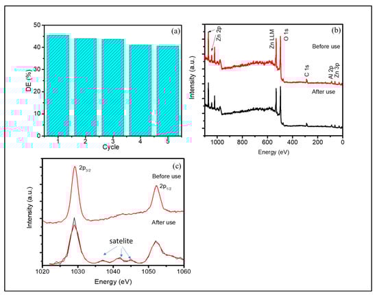Reusability is the important aspect for applicability in industrial-scale purposes. To check the reusability of photocatalyst, the recycling was conducted for the spent photocatalyst by filtering, washing with ethanol, and finally drying at 200 °C for 2 h. The recycled c-Zn-Al LDHs sample was further reused in the same treatment and the same condition. The DE of the recycled photocatalyst compared to the fresh one is presented in Figure 10a. The chart suggests that the DE remains stable within the range of 43–45% of the 5th cycle. This means that the photocatalyst is stable as shown by the reduced activity less than 10%. This stability performance was also confirmed by the XPS analysis presented in Figure 10b,c. The XPS spectrum shows the presence of Zn and Al as major components of the material without any significant change compared to the fresh sample. The survey scan spectrum (Figure 10b) shows the major peaks of Zn, O, and Al, clearly indicating the successful fabrication of c-Zn-Al LDHs, and the additional C peak is associated with the carbon tip used for analysis [18]. The intensity of the peaks of the after-use-sample remained unchanged, and there was no other atom identified. In the more-detailed analysis, there were some satellite peaks in the Zn 2p spectrum of the after-use-sample, which was attributed to the presence of other Zn species than Zn2+. This is usually associated with the change in some ZnO in the LDHs structure influencing the binding energy as the effect of oxidation reduction on the LDHs surface.