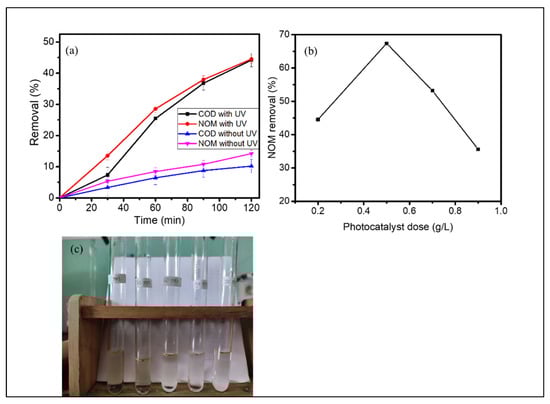 (a) Kinetics of NOM and COD removal of peat water photooxidation with and without UV light; (b) effect of c-Zn-Al LDHs photocatalyst dose on NOM removal by photooxidation with UV light; (c) some figures of initial and treated samples.