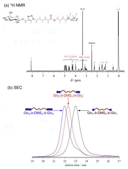 (a) 1H NMR spectrum of Glc1-b-DMSn-b-Glc1 in DMSO-d6 (400 MHz); (b) SEC traces of Glc1-b-DMSn-b-Glc1 (black), Glc2-b-DMSn-b-Glc2 (red) and Glc3-b-DMSn-b-Glc3 (blue) (eluent, DMF containing 0.01 mol L−1 LiCl; flow rate, 0.60 mL min−1).