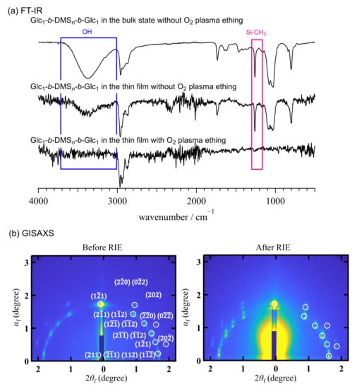 (a) ATR FT-IR spectra of Glc1-b-DMSn-b-Glc1 measured in the bulk state (upper) and measured in the thin film state before (middle) and after the RIE (lower); (b) GISAXS images of Glc1-b-DMSn-b-Glc1 before (left) and after the RIE (right).