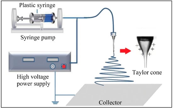 Electrospinning is a versatile and straightforward technique for fabricating micro/nanofibers employing electrostatic force, which uses polymer solutions or melts as raw materials. A conventional electrospinning system consists of three major components: a spinneret (supplying polymer sources), a high voltage power supply (providing electric forces), and a collector (collecting micro/nanofibers), as shown in Figure 1 [27]. During the process, the polymer solution or melt forms a “Taylor cone” at the end of the spinneret by continuously increasing the spinning voltage between the spinneret and the collector [28]. As the applied voltage exceeds a certain critical value, a polymer jet is ejected from the “Taylor cone” tip, which then solidifies into micro/nanofibers in the collector. The electrospinning technique possesses several attractive merits: simplicity, low cost, mass production, and wide application. There are three primary advantages of the electrospinning technique when recycling and reutilizing plastic waste, as shown in Figure 2 [29,30,31,32,33,34,35,36,37,38,39].