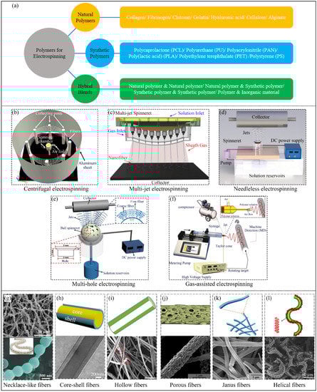 (a) Materials for electrospinning (b–f). Various technologies for electrospinning: (b) centrifugal electrospinning [29], (c) multi-jet electrospinning [30], (d) needleless electrospinning [31], (e) multi-hole electrospinning [32], and (f) gas-assisted electrospinning [33] (g–l) Special structures of electrospun fibers: (g) necklace-like fibers [34], (h) core-shell fibers [35], (i) hollow fibers [36], (j) porous fibers [37], (k) Janus fibers [38]. and (l) helical fibers [39]. (b,j) Reprinted with permission from ref. [29,37]. Copyright American Chemical Society. (c–i) Reprinted with permission from ref. [30,31,32,33,34,35,36]. Copyright Elsevier. (k) Reprinted with permission from ref. [38]. Copyright 2019 Springer. (l) Reprinted with permission from ref. [39]. Copyright 2020 Royal Society of Chemistry.