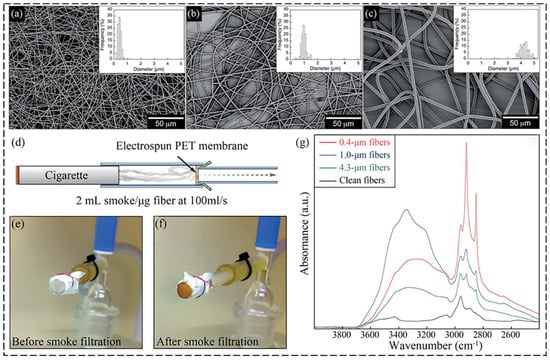 (a–c) Micrographs of electrospun fibers with different concentrations of PET: (a) 10 wt%, (b) 15 wt%, (c) 20 wt%. (d) Schematic illustration of smoke filtration testing (e–f). Photographs of fiber mats: (e) before and (f) after smoke filtration testing. (g) IR-spectroscopy of clean fiber mats and smoke-exposed fiber mats with average fiber diameters of 0.4, 1.0 and 4.3 mm. Reprinted with permission from ref. [72]. Copyright 2015 Royal Society of Chemistry.