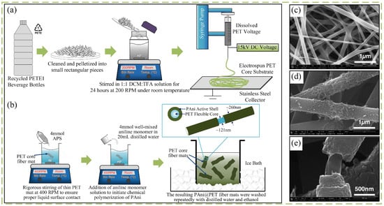 (a) Process of fabricating the PET core fibers from the recycled PETE1 recyclable beverage bottles. (b) The production process of PAni@PET core-shell fibers. (c) Morphology of the pure PET fibrous core. (d) PAni@PET core-shell structure. (e) SEM photograph of the exposed core. Reprinted with permission from ref. [99]. Copyright 2016 IOP Publishing.