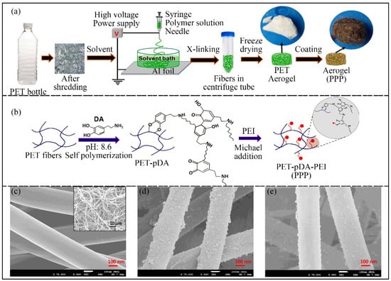 (a) Process of fabricating the 3D PPP aerogel from PET bottles. (b) Mechanisms for Michael addition reaction occurred during the surface modification process. (c–e) FESEM images of fibers: (c) pristine PET fibers, (d) pDA coated fibers (PET-pDA), and (e) PET-pDA-PEI (PPP) fibers. Reprinted with permission from ref. [104]. Copyright 2021 Elsevier.