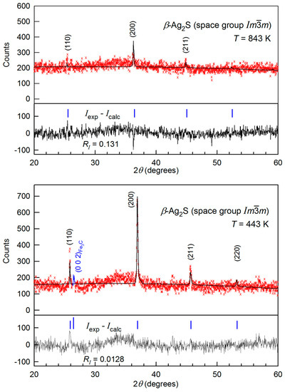 Experimental (×), calculated (—), and difference (Iexp—Icalc) XRD patterns of Ag2S pressed pill at temperatures of 443 and 843 K (According to the structure refinement, studied silver sulfide has bcc (space group ) structure of β-Ag2S argentite).