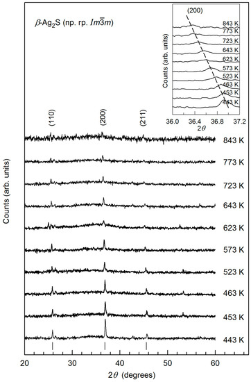 Changes in XRD patterns and parameters of unit cell for β-Ag2S argentite upon heating from 443 to 843 K are depicted in Figure 3 and Figure 4. The XRD spectra taken during heating from 443 to 843 K include diffraction reflections of only cubic β-Ag2S argentite (Figure 3). Rise in temperature leads to a continuous shift of the position of the argentite’s reflections to the field of smaller angles 2θ (for example, a shift of the (200) diffraction reflection is shown in Figure 3 (inset)). This corresponds to a growth in the lattice parameter aarg of argentite upon heating.