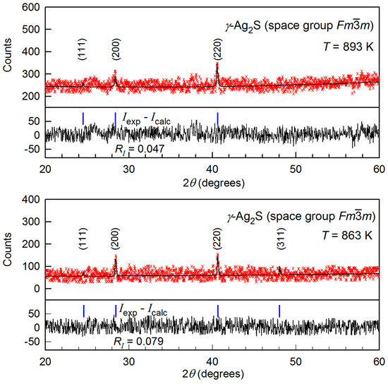 Experimental (×), calculated (—), and difference (Iexp—Icalc) XRD patterns of Ag2S pressed pill at temperatures of 863 and 893 K. Silver sulfide has a face-centered cubic (fcc) (space group ) γ-Ag2S structure at 863 and 893 K.