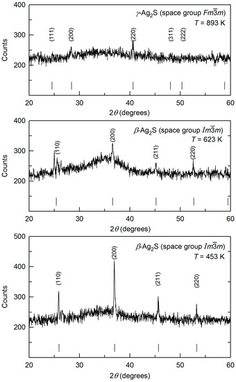 Regions of strong diffuse scattering are visible in XRD patterns of the superionic β-Ag2S and γ-Ag2S phases. Figure 7 shows the XRD patterns of β-Ag2S argentite at 453 and 623 K and γ-Ag2S phase at 893 K with regions of strong diffuse scattering.