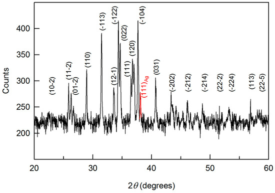 After heating the sample to 893 K, the XRD pattern (see Figure 7) contains only weak reflections of the fcc γ-Ag2S phase and a wide diffuse halo. Subsequent cooling of the sample to room temperature restores the monoclinic structure. However, in the XRD pattern, in addition to the reflections of the main monoclinic phase, there is a reflection (111) of cubic (space group ) metallic silver. This is clearly seen in Figure 8. Apparently, silver sulfide decomposes at temperatures above 800 K with isolation of metallic silver. Indeed, the composition of the γ-phase corresponds to the nonstoichiometric sulfide Ag1.7S (see Table 3) due to the precipitation of metallic Ag. The appearance of Ag whiskers on the surface of a pressed pill of silver sulfide heated in air to 570 K was detected in work [71]. The authors of work [42] observed the spontaneous appearance of silver whiskers as a result of heating of Ag2S to 800–900 K.