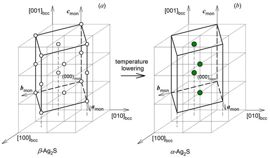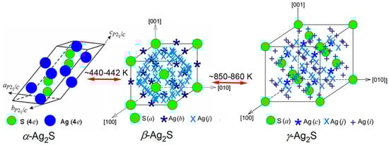 - Sadovnikov, S.I.; Gusev, A.I. Atomic displacements in the α-β phase transition in Ag2S and in Ag2S/Ag heterostructures. J. Exp. Theor. Phys. 2019, 129, 1005–1016. [Google Scholar] [CrossRef]