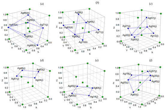 Thus, in cubic γ-Ag2S phase, the possible spacings between silver atoms (ions) are too small for positions (c), (j), and (i) to be filled by silver ions with a probability equal to 1. Therefore, the degree of occupying positions (c), (j), and (i) by Ag atoms are very small and amount to 0.088, 0.15, and 0.027 (see Table 3).