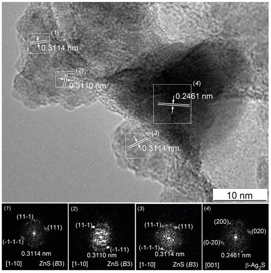 The microstructure, particle size, and element chemical composition of sulfide powders were studied by the high-resolution transmission electron microscopy (HRTEM) on a JEOL JEM-2010 microscope (JEOL Ltd., Tokyo, Japan) with 0.14 nm lattice resolution. The elemental chemical composition of heteronanoparticles was studied on the same microscope with the use of an Phoenix (EDAX) Energy Dispersive Spectrometer (AMETEK Inc. Berwyn, PA, USA), with a Si(Li) detector having an energy resolution of 130 eV.
