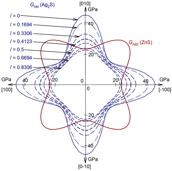 Information on the elastic characteristics of ZnS and Ag2S is needed to assess the strain (deformation) distortions at the interface between silver and zinc sulfides. The elastic properties of cubic ZnS are well known [22,23,24,25,26,27,28,29,30,31,32]. The theoretical data on the elastic properties of semiconductor monocrystalline particles of silver sulfide Ag2S with monoclinic (space group No. 11—P21/m) and orthorhombic (space group No. 63—Cmcm) structures are available in the form of databases on the websites [33,34]. According to [33], the maximal value of the Young’s modulus of modeling monoclinic (space group P21/m) silver sulfide is equal to ~37.9 GPa. According to data [34], the maximal Young’s modulus E of orthorhombic (space group Cmcm) Ag2S is ~48.1 GPa. The elastic constants are calculated by the ab initio method, described in general terms in the study [35].