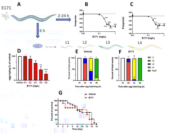 The effect of 0.1–0.5 mg/L of E171 on the ability of adult worms to reproduce was investigated by counting the number of laid eggs (Figure 1D). E171, in doses up to 0.3 mg/L, did not affect egg laying. However, there was a significant reduction in the reproductive capacity for concentrations ranging from 0.4 to 0.5 mg/L, with levels of 56% and 73%, respectively. E171, at 0.2 mg/L, modified the larval growth of worms, causing a significant increase in the speed of development compared to the vehicle (Figure 1E,F). Thirty-six hours after eggs hatched, E171-fed worms had a higher percentage of worms in L4 (91.7 ± 8.3%) than vehicle-fed worms (57.15 ± 6.2%), resulting in a much higher percentage of adult worms 12 h later. We also examined whether 0.2 mg/L of E171 affected worm survival, but no significant alterations were found. A median survival of 14 days and 12 days were observed for vehicle-fed worms and E171-fed nematodes, respectively (Figure 1G).