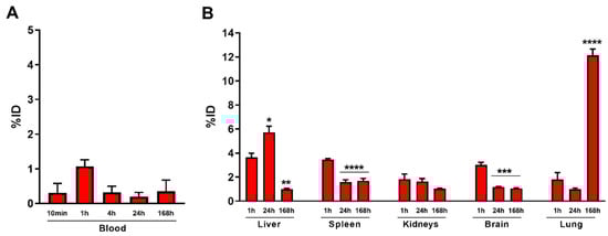 Healthy mice were then intravenously treated with E171 (6 mg/kg b.w.), and the elemental Ti concentrations (originating from the TiO2 NPs) in blood (Figure 3A) and filtering organs (Figure 3B) were determined by ICP-MS—from one hour up to one week after injection. Ti blood concentrations peaked one hour after injection, representing about 1% of the injected dose (ID). They then decreased substantially by ~60% after 4 h, and remained low for up to 168 h. This finding suggests that circulating E171 NPs were either rapidly accumulated in filtering organs or were being cleared out from the organism. The low TiO2 concentrations (in terms of detected Ti), as an ID percentage in liver, spleen, and kidneys, seem to confirm the hypothesis of rapid clearance and poor filtration by liver and spleen macrophages. The lack of accumulation in the kidneys at 1 and 24 h discards renal clearance as a potential explanation. As expected, there was a drastic decrease in TiO2 concentrations in the brain (in terms of detected Ti) between 1 and 24 h after injection. It is therefore likely that the amounts measured at the early time points were almost entirely due to the presence of TiO2 NPs circulating in the cerebral vessels. In contrast, the pattern of Ti accumulation in the lungs was surprisingly higher compared to other organs, and these levels increased over time (Figure 3B).