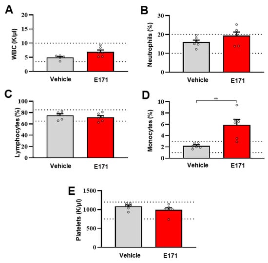Effect of E171 on complete blood cell count. (A) Total white blood cells (WBC), (B) neutrophils, (C) lymphocytes, (D) monocytes, and (E) platelets of mice, measured 12 h after the intravenous injection of E171. Control mice were treated with vehicle alone (Vehicle). The dotted lines indicate the upper and lower normal values for each variable (4–10 K/μL for WBC; 65–87% for lymphocytes; 10–20% for neutrophils; 1–3% for monocytes; and 750–1250 K/uL for platelets). Data are given as mean ± SEM (N = 6); ** p < 0.005 vs. vehicle mice, according to a two-tailed Mann–Whitney test.