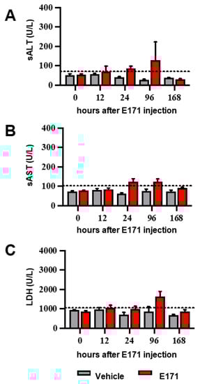 Effect of E171 on serum biochemical parameters. (A) sALT, (B) sAST, and (C) sLDH activity were measured in serum of mice before and after different E171 or vehicle injection times. The dotted lines indicate the upper normal value for each variable (43 U/L for sALT; 104 U/L for sAST; and 1100 U/L for LDH). Data are expressed a Units/Liter (U/L). Values are the mean ± SEM (N = 6). No significant differences were found between E171-treated mice vs. vehicle mice, according to two-way ANOVA and Bonferroni post hoc tests.