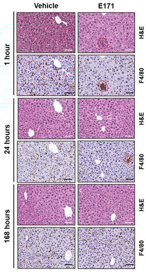 Pathological examination of livers of mice treated with E171. Representative images of liver hematoxylin–eosin (HE) and F4/80 immunostaining of mice injected with either vehicle or E171 and euthanized 1, 24, or 168 h after injection. Small microgranulomas were detected at 1 h and 24 h after E171 injection, but not at 168 h, indicative of low-grade transient inflammation due to E171. Scale bars = 50 μm.