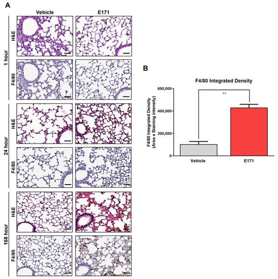 Pathological examination of the lungs of E171-injected mice. (A) Representative images of hematoxylin–eosin (HE) and F4/80 immunostaining of lung sections from mice treated with either vehicle or E171 and euthanized 1, 24, or 168 h after injection. (B) F4/80 immunoreactivity of slices from mice euthanized 168 h after treatment. Values are mean ± SEM (N = 5); ** p < 0.01 vs. vehicle, according to unpaired Student’s t-test. Scale bars = 50 μm.
