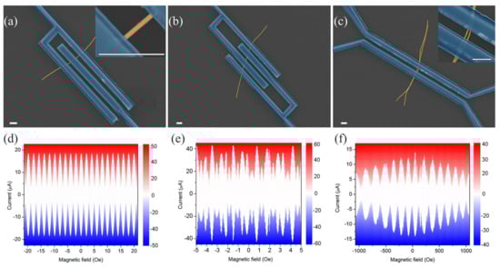 The sets of I-V curves presented in Figure 2d–f were measured at mK in various perpendicular magnetic fields. The sample A with a maximum critical current, , of 18.5 A, shows regular oscillations of critical current-magnetic field dependence with a period of about Oe (Figure 2d). The symmetry of curve shape indicates that the critical currents of the SQUID Josephson junctions are close in values. The depth of the critical current modulation can be used for the estimation of the SQUID circuit inductance to be less than , where is the flux quantum (h is Planck’s constant and e is the electron charge). Similar oscillations of for the sample B is irregular due to more complex geometry of the cell (the maximum critical current is A, see Figure 2e). For the sample C, the period of the oscillations is much longer and is approximately 140 Oe. The maximum critical current, A, decays twice in a field of 1000 Oe (Figure 2f).