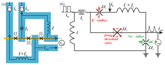 The application of superconducting materials [17,18,19] also allows for competing CMOS in the implementation of artificial neurons. Josephson junction switching provides the generation of picosecond-width quantized voltage spike of ∼mV amplitude accompanied by sub-aJ energy dissipation [20,21]. The shape of this spike can be quite close to the one produced in neurophysiological processes [22]. It was shown that an artificial neuron can be implemented using only two Josephson junctions [22,23] (see illustration in Figure 1). This is an order of magnitude less than the number of transistors in CMOS counterparts [16]. At the same time, it is possible to implement the synaptic memory using just single junction with ferromagnetic material [24,25,26,27,28,29,30]. The superconductivity enables ballistic signal transfer along the wires. The voltage spikes can be transmitted with a speed approaching the speed of light over long distances with low crosstalk [31]. Note that the Josephson junctions can be fabricated in any layer of multilayer superconducting circuit [32]. These features are favor for the implementation of complex and energy-efficient 3D neural networks closely mimic biological nerve tissue.