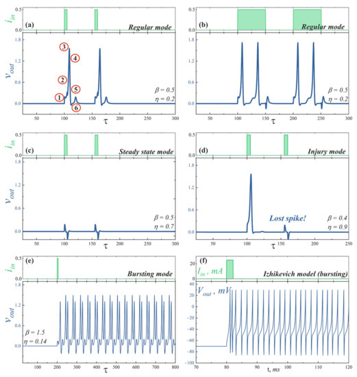 - Figure 4f illustrates the bursting dynamics of biological neuron simulated in the frame of the fractional-order Izhikevich model [72,73] for comparison, see also Supplementary Materials.