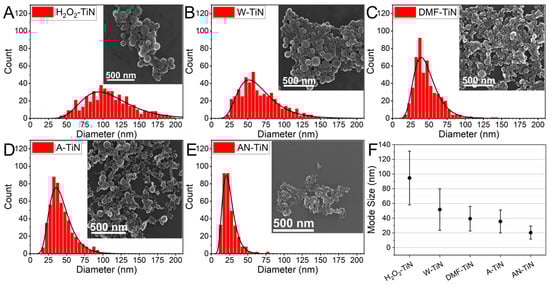 SEM characterization of NPs prepared by PLAL of TiN target in different liquids. (A–E) size histograms of H2O2-TiN, W-TiN, DMF-TiN, A-TiN, and AN-TiN NPs, respectively. Black curves are lognormal data fits. Insets demonstrate characteristic SEM images of the NPs. (F) Mode size of the lognormal fits of size distribution of NPs prepared in different liquids. Error bars represent distribution widths.
