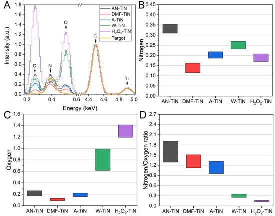Averaged EDX spectra of the NPs and an ablation target are shown in Figure 2A. As one can see, NPs synthesized in all liquids were oxidized, but the oxidation state was different. Indeed, AN-TiN, DMF-TiN, and A-TiN NPs were oxidized much weaker than H2O2-TiN and W-TiN NPs. Surprisingly, AN-TiN NPs had higher oxygen content than DMF-TiN NPs (and approximately equal oxygen content to A-TiN NPs), despite the absence of oxygen atoms in the molecular structure of acetonitrile. This result can be explained by a fast surface oxidation of the titanium nitride. Most of the TiN surface could be oxidized within several minutes, even at room temperature [30], while sample preparation procedure for the EDX measurements took several hours. Therefore, the surface of the analyzed NPs can be considered as almost fully covered by native oxides. Furthermore, AN-TiN NPs are almost two folds smaller than DMF-TiN or A-TiN NPs (Figure 1F), which means that AN-TiN NPs have a 4-fold large surface area. This could lead to overall higher oxygen signal from NPs prepared in acetonitrile due to the oxidation of a larger surface area. Another possible source of oxidation of AN-TiN NPs is atmospheric molecular oxygen dissolved in the acetonitrile, which could oxidize NPs during their formation by PLAL [29]. We tried to pump out the dissolved molecular oxygen O2 from the liquid by bubbling the liquids with N2 before and during the ablation process, but it did not lead to an increase of the nitrogen/oxygen ratio (data not shown).