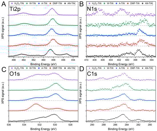 XPS characterization of the synthesized NPs. (A) Ti 2p, (B) N 1s, (C) O 1s, and (D) C 1s electronic levels of H2O2-TiN (purple), W-TiN (green), A-TiN (blue), DMF-TiN (red), and AN-TiN (black) NPs.