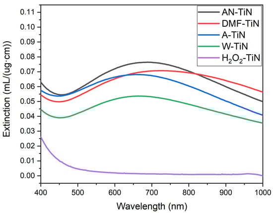 We finally measured the optical extinction spectra of TiN-based NPs in the visible and near-IR range. The spectra, normalized to mass concentration of Ti, are shown in Figure 4. As one can see, NPs synthesized in organic solvents (AN-TiN, DMF-TiN, A-TiN) exhibit broad peaks centered between 650 and 750 nm, with similar values of optical extinction in the near-IR. NPs ablated in nitrogen-containing liquids (AN-TiN and DMF-TiN) have slightly higher (~10%) optical extinction in near-IR than A-TiN NPs. W-TiN NPs have approximately 20% smaller value of the optical extinction due to the higher content of titanium oxide in the NP composition. H2O2-TiN NPs almost do not interact with light in red and near-IR range. This behavior is typical for TiO2 NPs [45], which additionally confirms that H2O2-TiN NPs are almost completely oxidized.