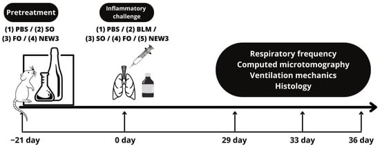Time course of treatment for investigating pulmonary morphophysiological changes. Pretreatment: four groups of animals received intragastric gavage for 21 days, saline solution (PBS) (healthy control), sunflower oil (SO), fish oil (FO) components, and fish oil nanoemulsion (NEW3). Inflammatory challenge: after 21 days, the inflammatory challenge with bleomycin was performed. On days 29, 33, and 36, the procedures were established: respiratory frequency, computer microtomography, ventilation mechanics, and separate materials for histology.