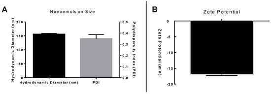 In other words, nanoencapsulation is used to extend natural oils shelf life and overcome some pharmacokinetics drawbacks, such as oral absorption. In this context, Figure 1 presents the fish oil nanoemulsion (NEW3) nanoscopic characterization. In Figure 2A, it is possible to observe the hydrodynamic diameter dispersion, with a mean value of 156 nm, while, in Figure 2B, the zeta potential dispersion is presented, with a mean value of −16.9 mV. The nanoscopic characterization is one important step of any kind of nanoemulsion. Understanding how the nanoemulsion is organized, in terms of size and electrophoretic mobility, can help us understand the biological behavior, as well as overtime stability [28,29].