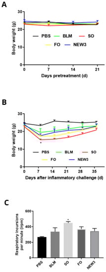 Pulmonary clinical aspects. (A) Body weight of mice during pre-treatment over 21 days. (n = 8). Legend: PBS: negative control group; BLM: positive control group; SO: group pretreated with sunflower oil (100 mg/kg); FO: animals pretreated with fish oil (100 mg/kg); NEW3: animals pretreated with fish oil nanoemulsion (100 mg/kg). (B) Body weight of mice over 36 days after pulmonary inflammatory challenge (n = 8). Legend: PBS: negative control group; BLM: positive control group challenged with BLM (5 mg/mL); SO: group pretreated with sunflower oil (100 mg/kg) and challenged with BLM (5 mg/mL); FO: group pretreated with fish oil (100 mg/kg) and challenged with BLM (5 mg/mL); NEW3: group pretreated with fish oil nanoemulsion (100 mg/kg) and challenged with BLM (5 mg/mL). Data are represented as mean ± standard deviation. Values were submitted to Tukey’s multiple comparison tests; * represents the statistically significant difference (p < 0.05), compared to the other experimental groups. (C) Respiratory rate on the 29th day after inflammatory challenge (n = 8). Caption: Irpm: respiratory incursions per minute. PBS: negative control group; BLM: positive control group challenged with BLM (5 mg/mL); SO: group pretreated with sunflower oil (100 mg/kg) and challenged with BLM (5 mg/mL); FO: group pretreated with fish oil (100 mg/kg) and challenged with BLM (5 mg/mL); NEW3: group pretreated with fish oil nanoemulsion (100 mg/kg) and challenged with BLM (5 mg/mL). Data are represented as mean ± standard deviation. Values were submitted to Tukey’s multiple comparison tests; * represents the statistically significant difference (p < 0.05), compared to the PBS group.