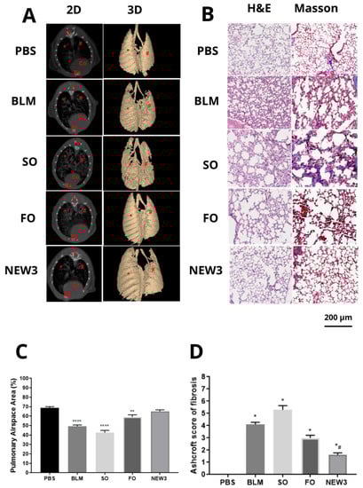 Pulmonary morphological aspects. (A) Micro-CT imaging after an inflammatory challenge. PBS, BLM, SO, FO, and NEW3 cross-section represented in 2D, and anterior region of the lungs represented in 3D of an animal; Co: heart; V: vertebra; Es: sternum bone. * right lung; # left lung. (B) Histology of the pulmonary parenchyma of BALB/c mice after an inflammatory challenge, stained using H&E and Masson’s trichrome techniques. PBS, control group treated with saline solution, seen by the H&E and Masson. BLM, positive control group treated with bleomycin, as seen by the H&E and Masson technique. SO treated with sunflower oil, as seen by the H&E and Masson. FO treated with fish oil, as seen by the H&E and Masson. NEW3 treated with fish oil nanoemulsion, seen by the H&E and Masson; 200 µm size reference bar. (C) Pulmonary airspace area. PBS: negative control group; BLM: positive control group, challenged with BLM (5 mg/mL); SO: group pretreated with sunflower oil (100 mg/kg) and challenged with BLM (5 mg/mL); FO: group pre-treated with fish oil (100 mg/kg) and challenged with BLM (5 mg/mL); NEW3: group pretreated with fish oil nanoemulsion (100 mg/kg) and challenged with BLM (5 mg/mL). Images (total: 20 for each group) of the lung parenchyma were captured to assess the air spacing of each group. The data are represented according to the mean ± standard deviation. The values were subjected to Tukey’s multiple comparison tests; ** represents the statistically significant difference (p < 0.05), compared to the PBS group; **** represents the statistically significant difference (p < 0.05), compared to the PBS group. (D) Scale of the degree of pulmonary fibrosis. Legend: PBS: negative control group; BLM: group positive control, challenged with BLM (5 mg/mL); SO: group pretreated with sunflower oil (100 mg/kg) and challenged with BLM (5 mg/mL); FO: group pre-treated with fish oil (100 mg/kg) and challenged with BLM (5 mg/mL); NEW3: group pretreated with fish oil nanoemulsion (100 mg/kg) and challenged with BLM (5 mg/mL). Data are represented according to the mean ± standard deviation. The values were subjected to Tukey’s multiple comparison tests; * represents the statistically significant difference (p < 0.05), compared to the PBS group; # represents the statistically significant difference (p < 0.05), compared to groups challenged with BLM.