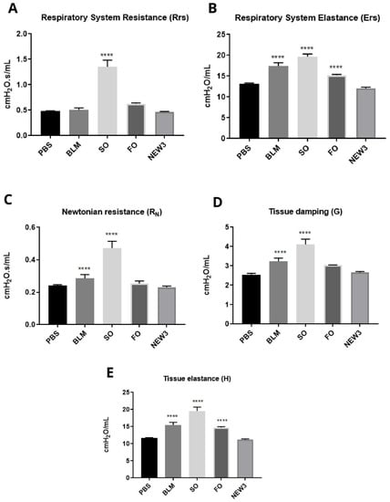 Pulmonary physiological aspects. (A) Respiratory system resistance (Rrs) on day 36, after inflammatory challenge (n = 8). (B) Respiratory system elastance (Ers) on day 36, after inflammatory challenge (n = 8). (C) Newtonian resistance (RN) on day 36, after inflammatory challenge (n = 8). (D) Tissue damping (G) on the 36th day, after inflammatory challenge (n = 8). (E) Tissue elastance (H) on day 36, after inflammatory challenge (n = 8). Legend: PBS: negative control group; BLM: positive control group, challenged with BLM (5 mg/mL); SO: group pretreated with sunflower oil (100 mg/kg) and challenged with BLM (5 mg/mL); FO: group pretreated with fish oil (100 mg/kg) and challenged with BLM (5 mg/mL); NEW3: group pretreated with fish oil nanoemulsion (100 mg/kg) and challenged with BLM (5 mg/mL). Data are represented as mean ± standard deviation. Values were submitted to Tukey’s multiple comparison tests; **** represents the statistically significant difference (p < 0.05), compared to the PBS group.