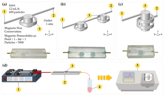 (a) Simulation geometry and actual picture of one-loop microreactor. (b) Simulation geometry and actual picture of the two-horizontal-microreactor. (c) Simulation geometry and actual picture of the two-vertical-loop microreactor. (d) Schematic of the experimental setup for the biotransformation process. The numbers 1, 2, 3, 4, and 5 in the figure correspond to the solution injection, microreactor, permanent magnet, treated sample, and absorbance analysis, respectively.
