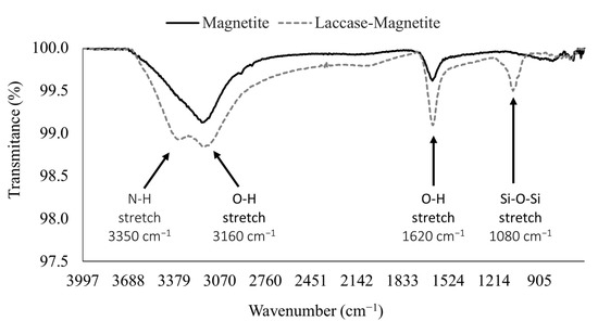 FTIR was carried out to confirm the immobilization of laccase on magnetite nanoparticles (laccase-magnetite) (Figure 2). Bare magnetite exhibited two bands at 1620 and 3160 cm−1 related to the vibration of the hydroxyl groups on the surface of the magnetite ν (Fe-OH) [39,40]. Laccase-magnetite nanobiocomposites presented a peak at 3350 cm−1 attributed to the NH stretching vibration of laccase amines and a peak at 1080 cm−1 characteristic of the Si-O-Si bond resulting after silanization [39].