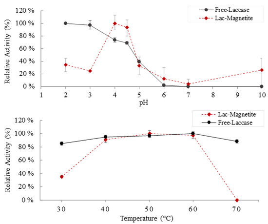 We evaluated the impact of pH and temperature on enzyme activity (Figure 3). Optimal activity for the free-laccase was observed under acidic conditions (maximum activity at pH 2). Similar optimal values between pH 2–4 were reported previously [41]. In contrast, for pH values of 6 and above, the activity decreases and becomes almost negligible. In the case of the bionanocomposites, maximum activity was observed at pH 4, followed by a considerable decrease for pH values of 6 and above. The change in the optimal pH for Laccase-Magnetite to higher values is likely caused by an uneven concentration of the H+ and OH− ions between the support matrix and the bulk solution [33]. Regarding the effects of temperature on the activity of the enzyme, both the immobilized laccase and the free laccase showed more than 85% of relative activity between 40 and 60 °C; in both cases (free-laccase and laccase-magnetite), there is a pronounced deactivation effect above 60 °C, being slightly higher for the immobilized laccase, losing around 15–30% of the relative activity.