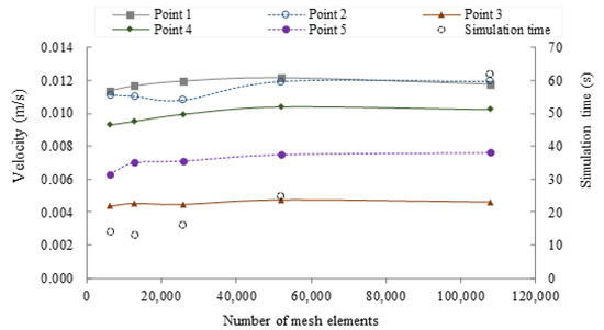 Mesh convergence analysis for the one-loop torus microreactor. Five points along the computational domain were selected for the analysis and plotted as a function of number of mesh elements. Additionally, the simulation time for the different levels of meshing is presented as dotted circles.