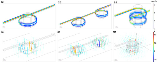 (a) Velocity profile of one-loop microreactor. (b) Velocity profile of two-horizontal-loop microreactor. (c) Velocity profile of two-vertical−loop microreactor. (d) Magnetic field flux of one-loop microreactor. (e) Magnetic field flux of two-horizontal-loop microreactor. (f) Magnetic field flux of two-vertical-loop microreactor.