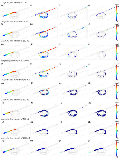 The time evolution of the particle’s transport within the one-loop microreactor was studied under varying intensities of the applied magnetic field (i.e., 0, 50, 100, 200, 300, 350, 500, and 1000 mT). The simulations were conducted for a total time of 30 s with data collection at 1, 5, 15 and 25 s (See Figure 6). For these simulations, each particle trajectory is random and driven by the exerted drag and magnetophoretic forces. As the particles are attracted to the magnet and due to the interplay of involved forces in the loop, they follow a parabolic trajectory until finally sticking to the wall of the microreactor channel. For some particles, the magnetic field will not be enough to retain them within the loop. These unique trajectories have been exploited by others for the separation and manipulation of magnetic particles within microchannels [42]. In our case, the movement is enough to perturb the laminar flow, thereby generating mixing patterns that are useful to promote the intimate interaction of the nanoparticles with other components present in the solution. This was also evidenced by a better suspension of the nanoparticles as the magnetic field was increased.