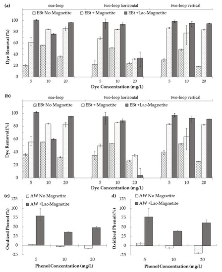 Phenol removal was evaluated using the two-vertical-loop system (best performing microreactor from the three evaluated), at three initial phenol concentrations (5, 10 and 20 mg/L). Data (Figure 7c,d) are presented for the two types of analysis implemented in this work i.e., absorbance peak and area under the absorbance spectrum. The maximum phenol biotransformation was approximately 75% (3.75 mg/g phenol/laccase-magnetite) for the lowest phenol concentration, followed by approximately 50% (10 mg/g) at the highest concentration, and approximately 35% (3.5 mg/g) at the middle concentration. The initial ratio between mass of laccase and phenol for each experiment corresponded to 2.6, 1.3, and 0.65 µg/mg, and the ratio between activity of laccase and phenol mass was 0.00192, 0.00096, and 0.00048 U/mg, for the phenol concentrations mentioned above. Further research is needed to identify the potential intermediates that result from the transformation of the dye or phenol, their potential toxicity, and the potential need to include additional systems carrying other enzymes to complete the biodegradation process.