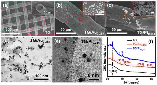 (a) SEM image of a TG mesh and a magnified graphene tube in the inset; (b,c) SEM images of the TG/Au0.258 and TG/Pt0.241, respectively; (d,e) Corresponding TEM images of (b,c), respectively. (f) XRD patterns of the TG, TG/Au0.258, and TG/Pt0.241.